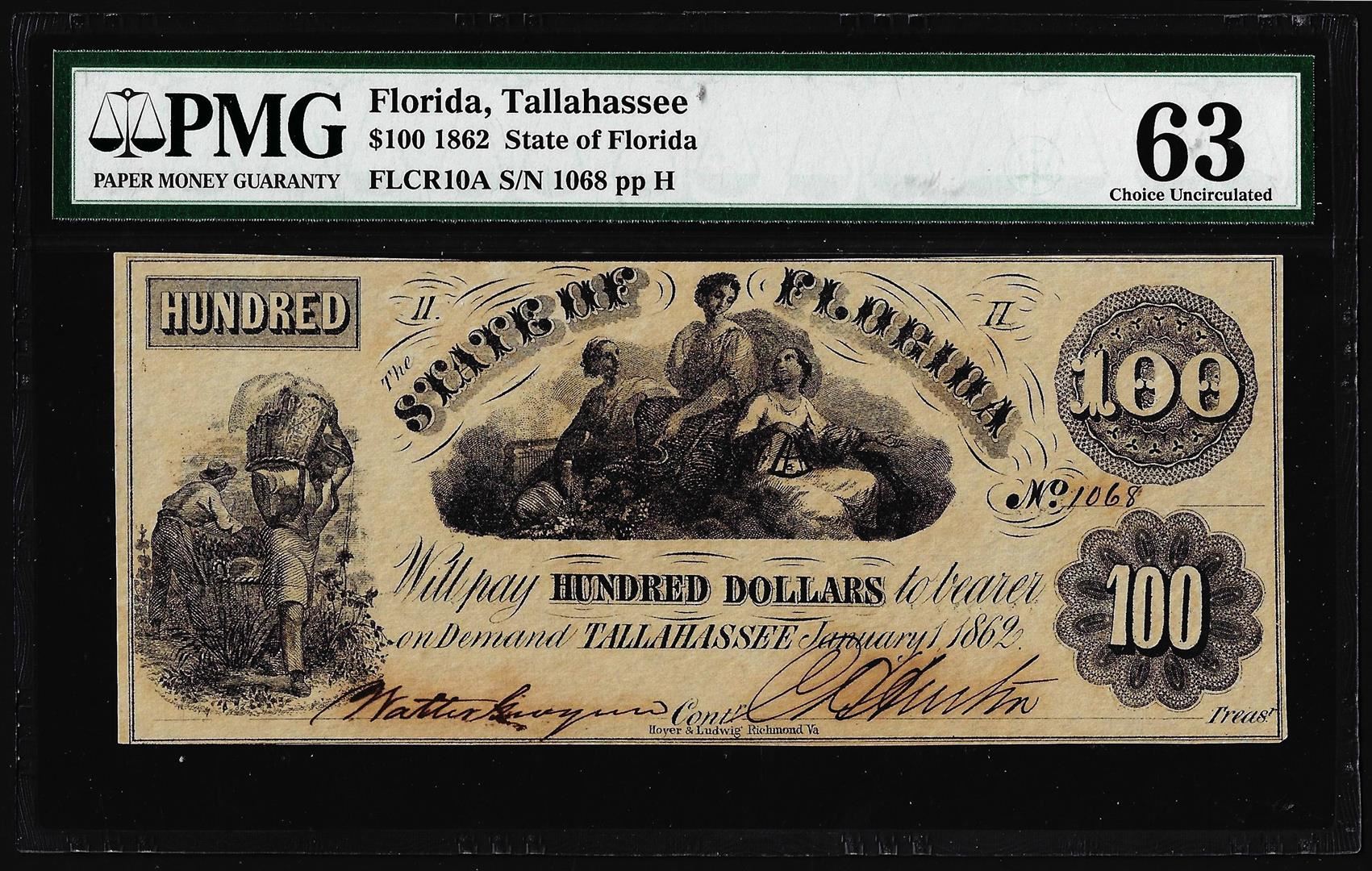 One 1862 $100 State of Florida Tallahassee Cr.10A Obsolete Note PMG Ch. Uncirculated 63. PMG Certified.