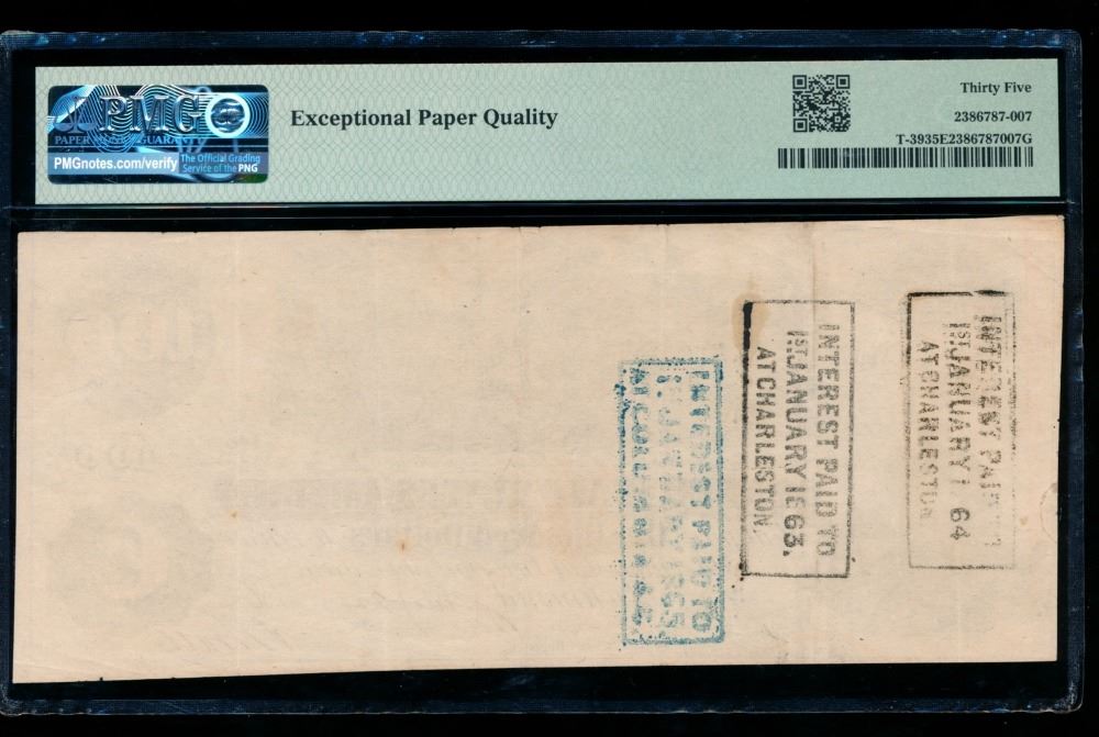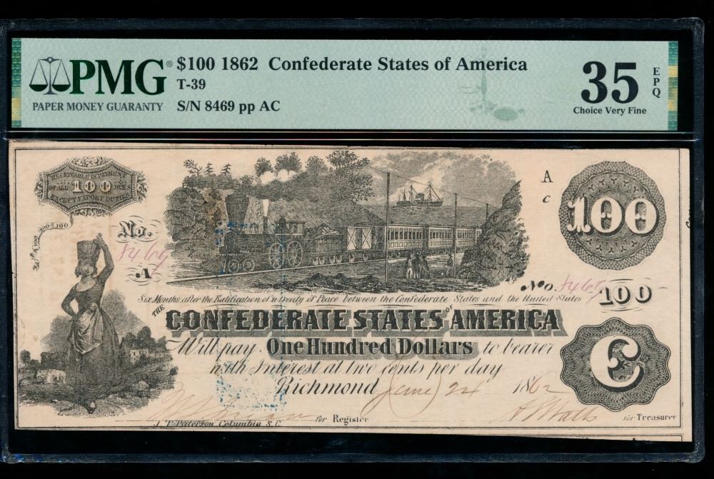 One 1862 $100 T-39 Confederate PMG 35EPQ.