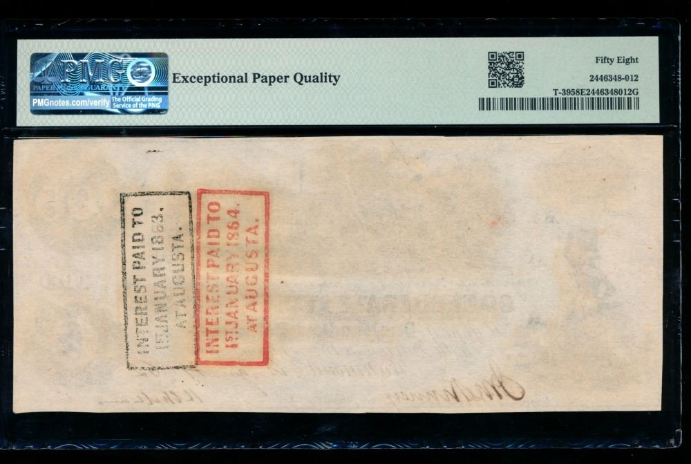 One 1862 $100 T-39 Confederate PMG 58EPQ.