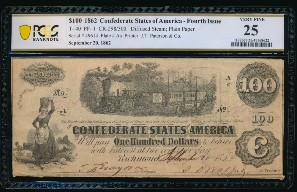 One 1862 $100 T-40 Confederate PCGS 25.