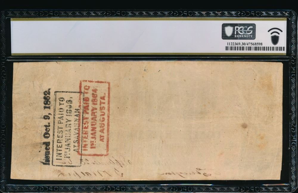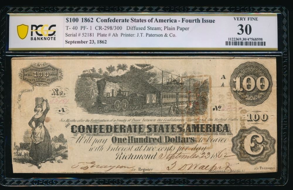 One 1862 $100 T-40 Confederate PCGS 30.