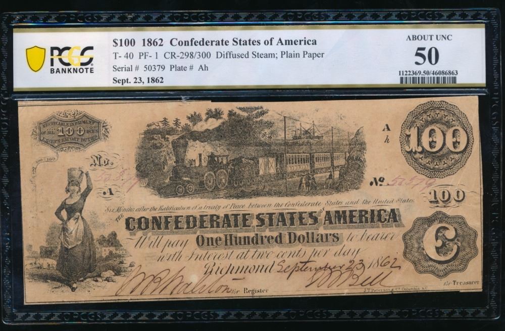 One 1862 $100 T-40 Confederate PCGS 50.