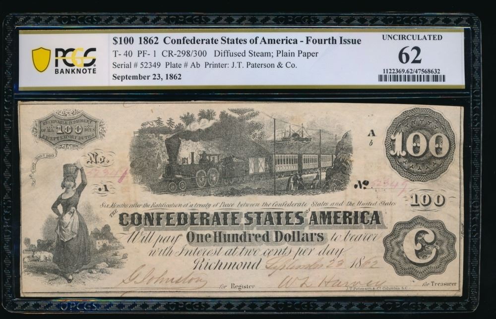 One 1862 $100 T-40 Confederate PCGS 62.