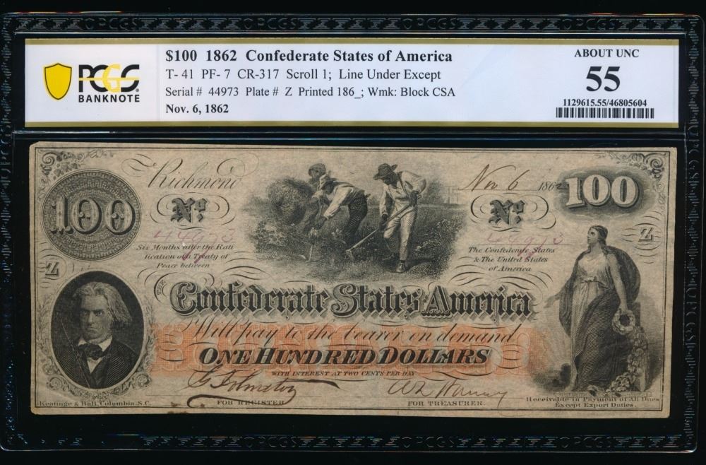 One 1862 $100 T-41 Confederate PCGS 55.