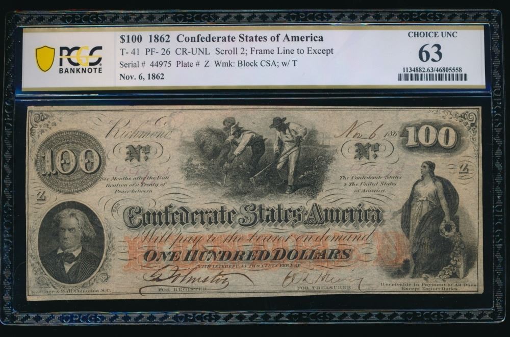 One 1862 $100 T-41 Confederate PCGS 63.