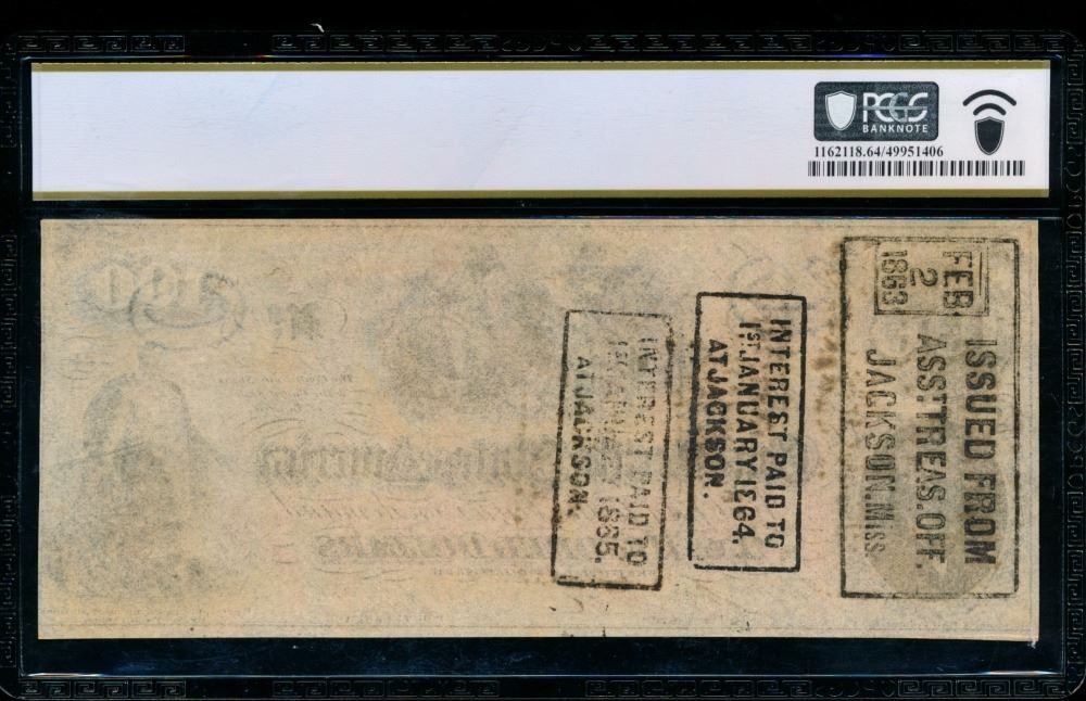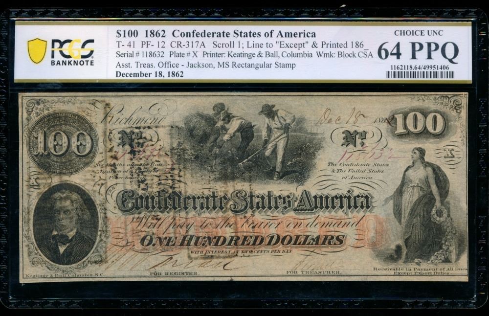 One 1862 $100 T-41 Confederate PCGS 64PPQ.