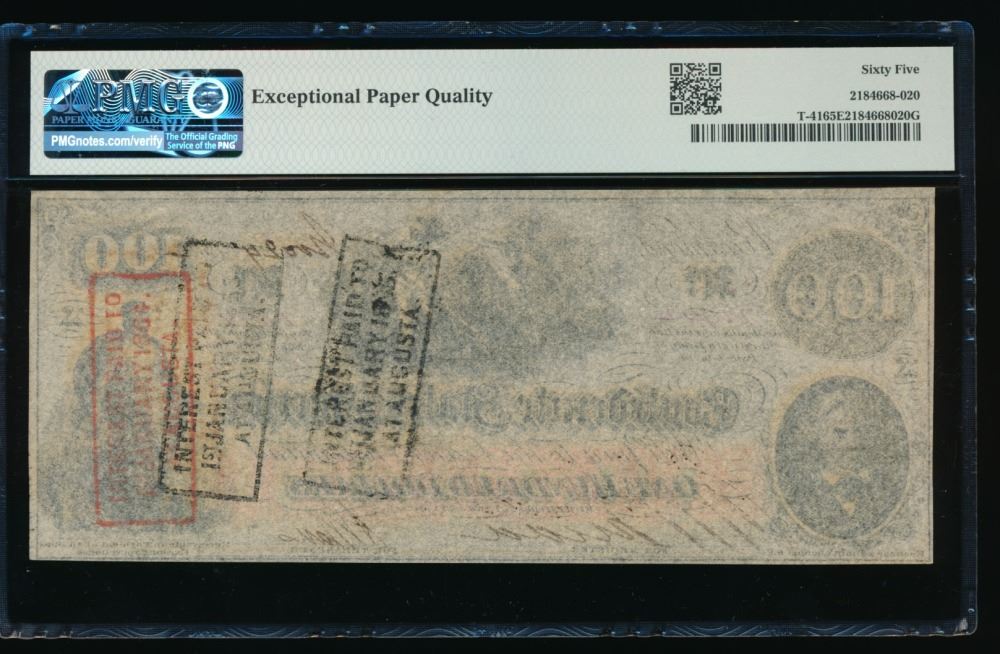 One 1862 $100 T-41 Confederate PMG 65EPQ.