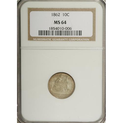 <B>1862 10C MS64 NGC.</B></I> A basically untoned example of this popular Civil War date, with just a light touch of lilac on each side. Near-Gem quality, despite some softness on Liberty's head and on the reverse at the lower wreath.<BR><I>Ex: Stack's 71st Anniversary Sale (10/2006), lot 2668.</B></I><BR><BR><b>Shipping:</b> Coins & Currency (<a target="_blank" href="http://www.heritageauctions.com/common/shipping.php">view shipping information</a>)