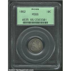 <TR><TD width="100%"><TABLE cellSpacing=1 cellPadding=3 width="100%" border=0><TBODY><TR><TD width="100%" bgColor=#79735c><FONT face=arial color=#ffffff size=3><B>Description</B> </FONT></TD></TR><TR><TD width="100%" bgColor=#ffffff><FONT face=arial size=2><B>1862 10C MS66 PCGS.</B></I> Sharply struck and exquisitely preserved, each side has a blanket of deep patina, with multiple colors which include mauve, green, and olive-brown. There is a small contact mark on Liberty's left (facing) forearm, which is the only visible surface blemish. A marvelous, premium quality Gem, conditionally rare and destined to reside in a high-quality collection of this popular type. Population: 7 in 66, 2 finer (4/03). </FONT></TD></TR></TBODY></TABLE></TD></TR></TBODY></TABLE><BR><A name=PricesRealized></A><TABLE cellSpacing=0 cellPadding=0 width="100%" bgColor=#000000 border=0><TBODY><TR><TD width="100%"><TABLE cellSpacing=1 cellPadding=3 width="100%" border=0><TBODY><TR><TD width="100%" bgColor=#79735c><A name=PR><FONT face=arial color=#ffffff size=3><B>Previous Prices from Heritage Auctions</B> </FONT></A></TD></TR><TR><TD bgColor=#f6f6ed><TABLE cellSpacing=0 cellPadding=0 width="100%" border=1><TBODY><TR><TD align=middle width="33%"><B>Date</B></TD><TD align=middle width="33%"><B>Service</B></TD><TD align=middle width="33%"><B>Price</B></TD></TR><TR bgColor=whitesmoke><TD width="33%"><B>07/30/2002</B></TD><TD width="33%">NGC</TD><TD width="33%">$2,530.00</TD></TR><TR bgColor=whitesmoke><TD width="33%"><B>11/01/1998</B></TD><TD width="33%">NGC</TD><TD width="33%">$1,725.00</TD></TR></TBODY></TABLE></TD></TR><TR><TD bgColor=#ffffff><FONT face=arial size=1 ?>PLEASE NOTE: All prices realized reflect the final hammer price PLUS the buyer's premium in auctions that charge a buyer's premium. Each item has a notation at the top of the listing indicating whether that lot included a buyer's premium. Example: A item that sells with a final hammer price of $100 and a 20% buyer's premium will display with a price realized of $120. All information listed is intended to be as accurate as possible, but errors are possible. Please use this guide carefully and inform us of any inaccuracies. </FONT></TD></TR></TBODY></TABLE></TD></TR></TBODY></TABLE><BR><TABLE cellSpacing=0 cellPadding=0 width="100%" bgColor=#000000 border=0><TBODY><TR><TD width="100%"><TABLE cellSpacing=1 cellPadding=3 width="100%" border=0><TBODY><TR><TD width="100%" bgColor=#79735c colSpan=6><FONT face=arial color=#ffffff size=3><B>Price Guide*</B> </FONT></TD></TR><TR bgColor=#f6f6ed><TD align=middle><B>Grade</B> </TD><TD align=middle><B>Coin World<BR>(Trends)</B> </TD><TD align=middle><B>Numismedia<BR>Retail</B> </TD><TD align=middle><B>Numismedia<BR>Wholesale</B> </TD><TD align=middle><B>Coin<BR>Universe</B> </TD><TD align=middle><B>Heritage<BR>Value Index</B> </TD></TR><TR bgColor=#ffffff><TD align=middle>65</TD><TD align=right>---</TD><TD align=right>---</TD><TD align=right>$950.00</TD><TD align=right>$1,175.00</TD><TD align=right>$856.67</TD></TR><TR style="FONT-WEIGHT: bold" bgColor=#cccfdd><TD align=middle>66</TD><TD align=right>---</TD><TD align=right>---</TD><TD align=right>---</TD><TD align=right>$2,600.00</TD><TD align=right>$1,820.00</TD></TR><TR bgColor=#ffffff><TD align=middle>67</TD><TD align=right>---</TD><TD align=right>---</TD><TD align=right>---</TD><TD align=right>---</TD><TD align=right>---</TD></TR><TR bgColor=#ffffff><TD colSpan=6><FONT size=1>*All information listed is intended to be as accurate as possible, but errors are possible. No item may be returned or refused based on this information which is provided as a service to our customers. You should contact each pricing source directly to determine the accuracy of this information. </FONT></TD></TR></TBODY></TABLE></TD></TR></TBODY></TABLE><BR><TABLE cellSpacing=0 cellPadding=0 width="100%" bgColor=#000000 border=0><TBODY><TR><TD width="100%"><TABLE cellSpacing=1 cellPadding=3 width="100%" border=0><TBODY><TR><TD width="100%" bgColor=#79735c><FONT face=arial color=#ffffff size=3><B>Population Guide</B> </FONT></TD></TR><TR bgColor=#ffffff><TD align=middle><!-- Begin Output of Population Grid--><TABLE cellSpacing=0 cellPadding=0 width="100%" border=0><TBODY><TR><TD vAlign=center><TABLE cellSpacing=0 width="100%" border=1 cellsadding="3"><TBODY><TR><TD vAlign=center><TABLE cellSpacing=0 cellPadding=3 width="100%" border=1><TBODY><TR><TD vAlign=center align=middle bgColor=#f0f1e8 colSpan=2 <CENTER><FONT face=Arial size=2><B>PCGS Pop </B></FONT><CENTER></CENTER></TD><TD vAlign=center align=middle bgColor=#f0f1e8 colSpan=2><CENTER><FONT face=Arial size=2><B>NGC Pop</B></CENTER></FONT></TD></TR><TR><TD vAlign=center><FONT face=Arial size=2>(66)</FONT> </TD><TD vAlign=center align=right><FONT face=Arial size=2>7</FONT> </TD><TD vAlign=center><FONT face=Arial size=2>(66)</FONT> </TD><TD vAlign=center align=right><FONT face=Arial size=2>13</FONT> </TD></TR><TR><TD vAlign=center><FONT face=Arial size=2>(>66)</FONT> </TD><TD vAlign=center align=right><FONT face=Arial size=2>2</FONT> </TD><TD vAlign=center><FONT face=Arial size=2>(>66)</FONT> </TD><TD vAlign=center align=right><FONT face=Arial size=2>0</FONT> </TD></TR></TBODY></TABLE></TD></TR></TBODY></TABLE></TD></TR></TBODY></TABLE><!-- End Output of Population Grid--></TD></TR></TBODY></TABLE></TD></TR></TBODY></TABLE><BR><TABLE cellSpacing=0 cellPadding=0 width="100%" bgColor=#000000 border=0><TBODY><TR> Important notice: We expect to be auctioning lots at the rate of 200-250 per hour. On occasion eBay live bid software cannot keep up with the pace of the auctions where 4-5 lots per minute can hammer down, so we recommend that you place a realistic absentee bid now as insurance to avoid disappointment. Also please note that all Heritage/CAA lots purchased through eBay Live carry a 20% Buyer's Premium. Please make sure you read the Terms and Conditions.