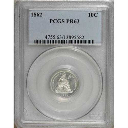 <B>1862 10C PR63 PCGS.</B></I> PCGS Population (33/30). NGC Census: (19/54). Mintage: 550. Numismedia Wsl. Price for NGC/PCGS coin in PR63: $458. (#4755)<BR><BR><B>Coin Engraver:</B> Christian Gobrecht<BR><BR><b>Shipping:</b> Coins & Currency (<a target="_blank" href="http://www.heritageauctions.com/common/shipping.php">view shipping information</a>\)