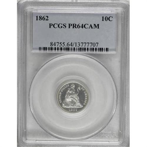 <B>1862 10C PR64 Cameo PCGS.</B></I> Both sides offer strong contrast and vibrant reflectivity through a delicate layer of unobtrusive silver-gray patina. An enticing Civil War-era proof that shows light, though grade-defining hairlines in the obverse fields. Population: 4 in 64 Cameo, 2 finer (8/07).<BR><BR><b>Shipping:</b> Coins & Currency (<a target="_blank" href="http://www.heritageauctions.com/common/shipping.php">view shipping information</a>)