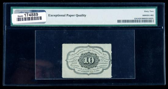 1862, 10¢ Fractional Currency. First Issue, perforated edges. PMG Uncirculated 62EPQ. . Fr-1241. The margins are tight at the left end, accounting for the grade, otherwise this scarce perforated edge note with no monogram appears virtually flawless from the standpoint of paper quality.