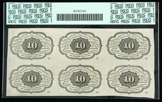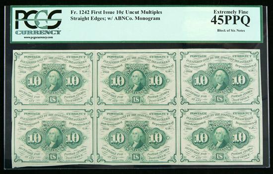 1862, 10¢ Fractional Currency. First Issue, straight edges. Block of Six Notes. PCGS Extremely Fine 45PPQ. . Fr-1242. A partial sheet of six notes, with the only grade limiting factors being a few storage folds and some minor handling.