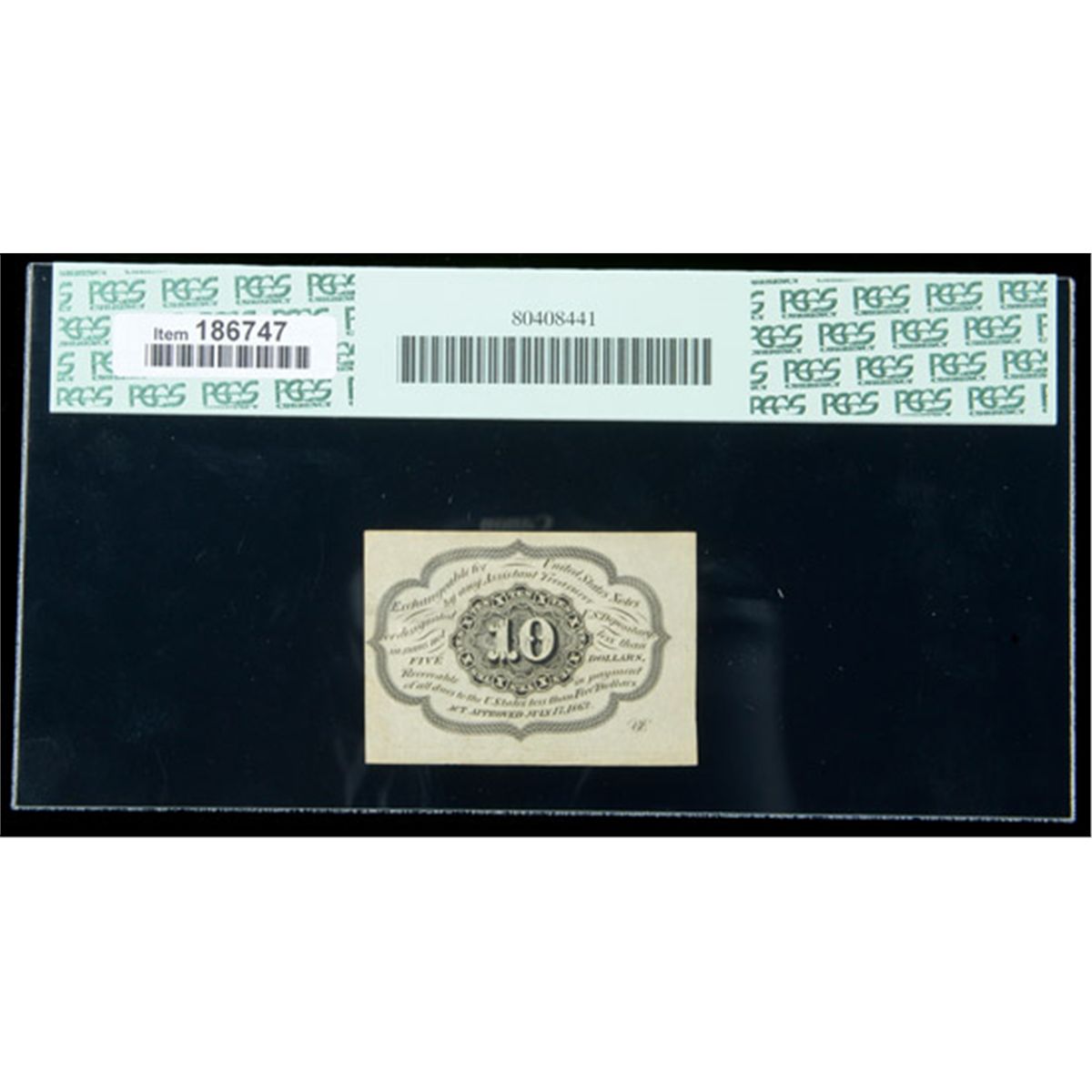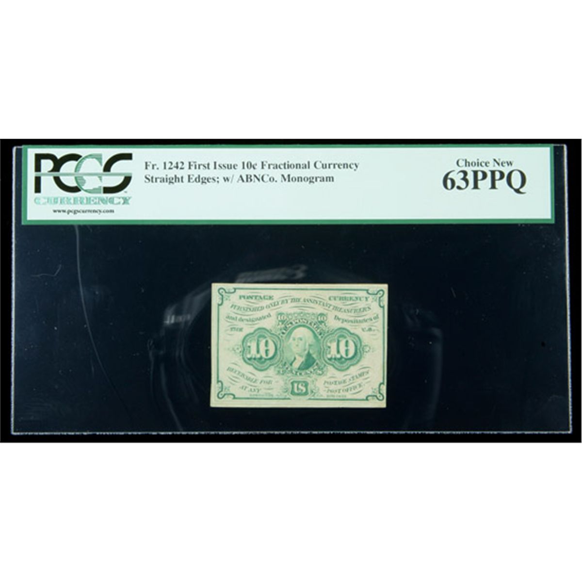 1862, 10¢ Fractional Currency. First Issue, straight edges, with ABCO monogram. PCGS Choice New 63PPQ. . Fr-1242. Although the margins aren't perfect, the paper is fully original and the eye appeal is substantial for the grade.