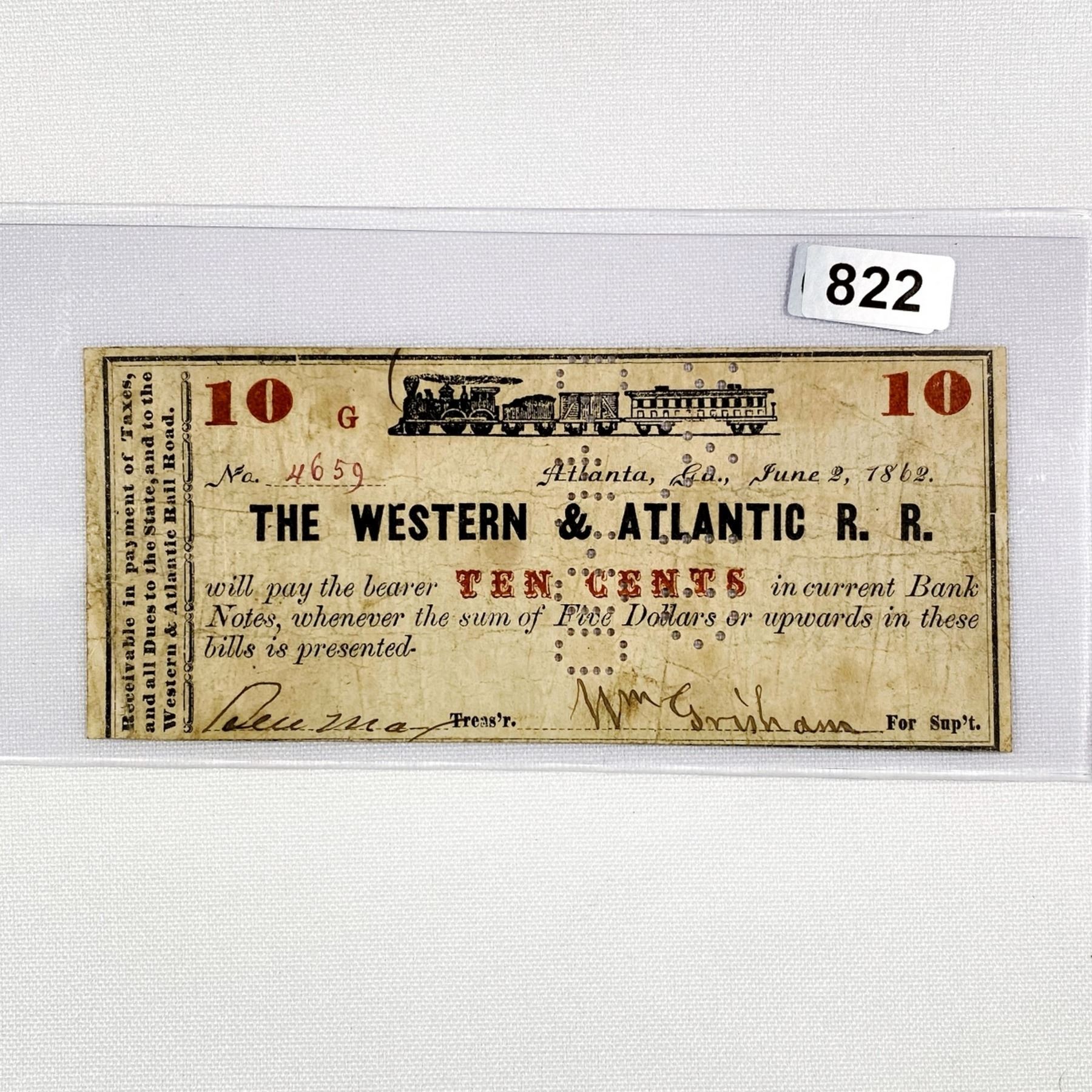 1862 10c Western & Atlantic R.R. Note