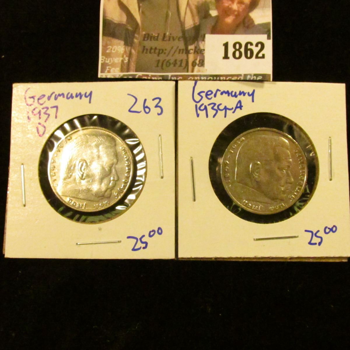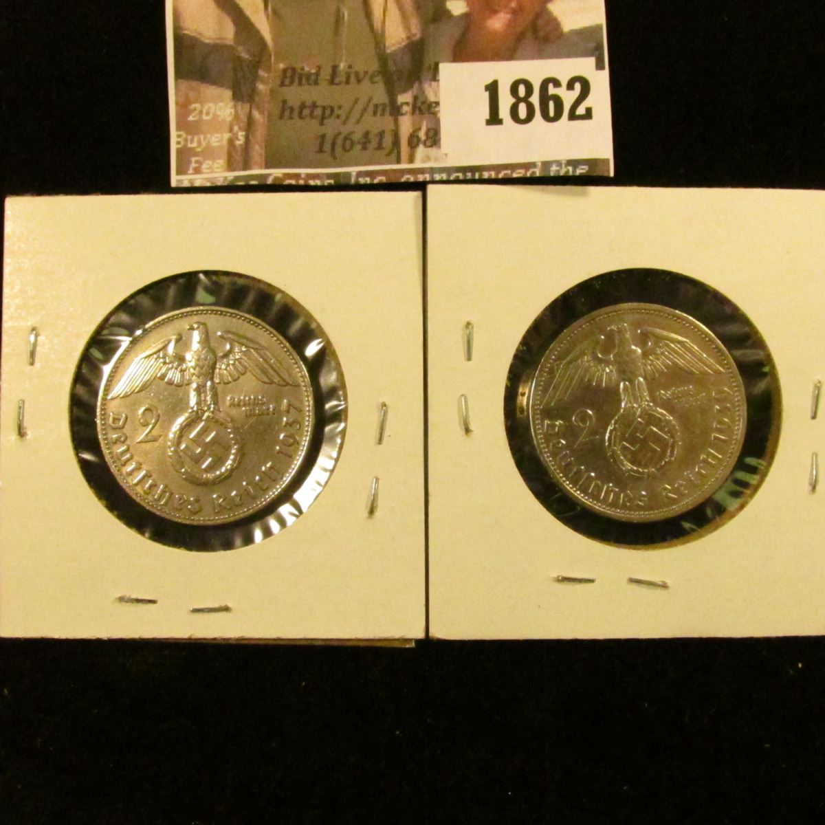 1937-D and 1939-A Silver German 2 Mark Coins. They Both Gave An Eagle and Swastika On The Reverse Of The Coins