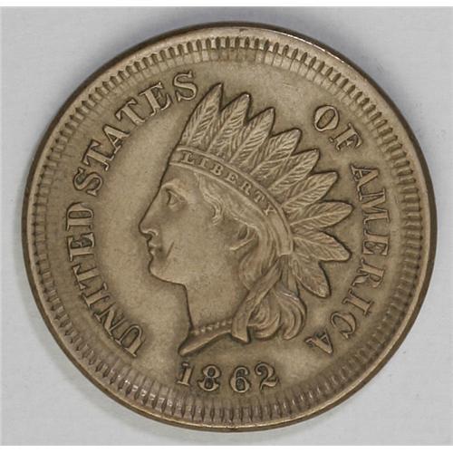 <B>1862<1C> Indian Cent--Broadstruck--MS60 Details, Lightly Cleaned Uncertified.</B></I> This broadstruck piece features wide, distorted dentils, and UNITED STATES OF AMERICA is stretched toward the rim. Only slightly uncentered, with the rim widest at 1 o'clock. This precisely struck piece has a few faint hairlines on the left obverse field, and there are no marks worthy of comment.