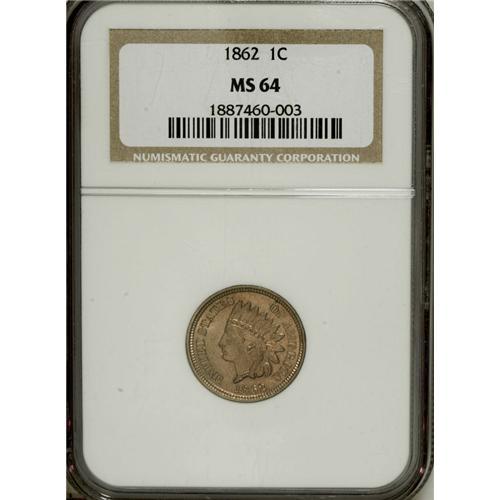 <B>1862 1C MS64 NGC.</B></I> NGC Census: (448/189). PCGS Population (484/244). Mintage: 28,075,000. Numismedia Wsl. Price: $232. (#2064)<BR><BR><b>Shipping:</b> Coins & Currency (<a target="_blank" href="http://www.heritageauctions.com/common/shipping.php">view shipping information</a>)