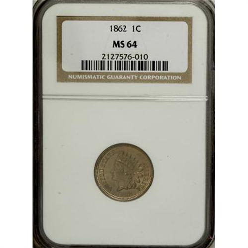 <B>1862 1C MS64 NGC.</B></I> NGC Census: (458/191). PCGS Population (511/252). Mintage: 28,075,000. Numismedia Wsl. Price for NGC/PCGS coin in MS64: $232. (#2064)<BR><BR><B>Coin Engraver:</B> James B. Longacre<BR><BR><b>Shipping:</b> Coins & Currency (<a target="_blank" href="http://www.heritageauctions.com/common/shipping.php">view shipping information</a>)