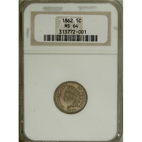 <B>1862 1C MS64 NGC.</B></I> NGC Census: (458/191). PCGS Population (512/252). Mintage: 28,075,000. Numismedia Wsl. Price for NGC/PCGS coin in MS64: $232. (#2064)<BR><BR><B>Coin Engraver:</B> James B. Longacre<BR><BR><b>Shipping:</b> Coins & Currency (<a target="_blank" href="http://www.heritageauctions.com/common/shipping.php">view shipping information</a>)