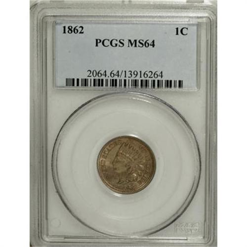 <B>1862 1C MS64 PCGS.</B></I> PCGS Population (507/251). NGC Census: (453/195). Mintage: 28,075,000. Numismedia Wsl. Price for NGC/PCGS coin in MS64: $232. (#2064)<BR><BR><B>Coin Engraver:</B> James B. Longacre<BR><BR><b>Shipping:</b> Coins & Currency (<a target="_blank" href="http://www.heritageauctions.com/common/shipping.php">view shipping information</a>)