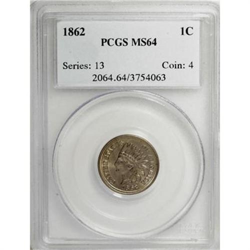 <B>1862 1C MS64 PCGS.</B></I> PCGS Population (513/252). NGC Census: (458/191). Mintage: 28,075,000. Numismedia Wsl. Price for NGC/PCGS coin in MS64: $280. (#2064)<BR><BR><B>Coin Engraver:</B> James B. Longacre<BR><BR><b>Shipping:</b> Coins & Currency (<a target="_blank" href="http://www.heritageauctions.com/common/shipping.php">view shipping information</a>)