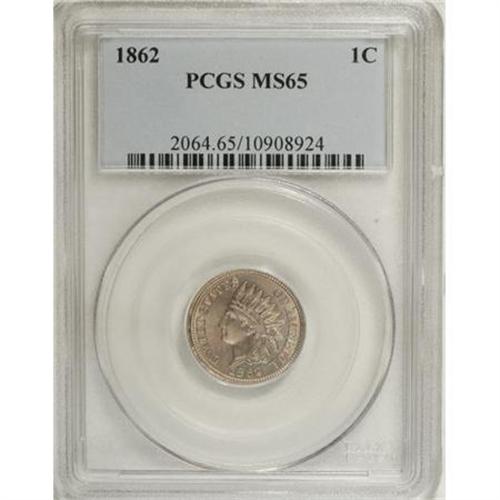 <B>1862 1C MS65 PCGS.</B></I> Boldly detailed on the reverse but somewhat soft on the Liberty's headdress, hair, and ribbon. Satin luster warms the carefully preserved, unmarked surfaces. <BR><BR><b>Shipping:</b> Coins & Currency (<a target="_blank" href="http://www.heritageauctions.com/common/shipping.php">view shipping information</a>)
