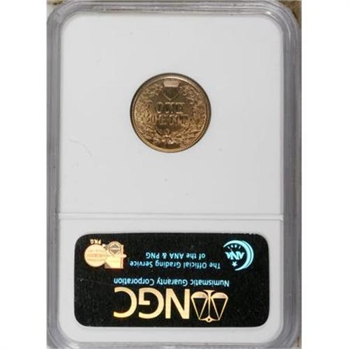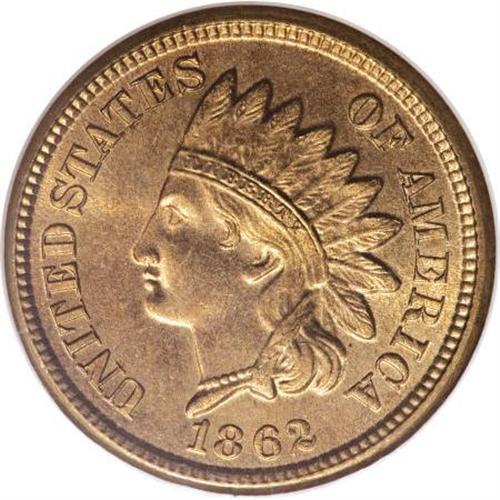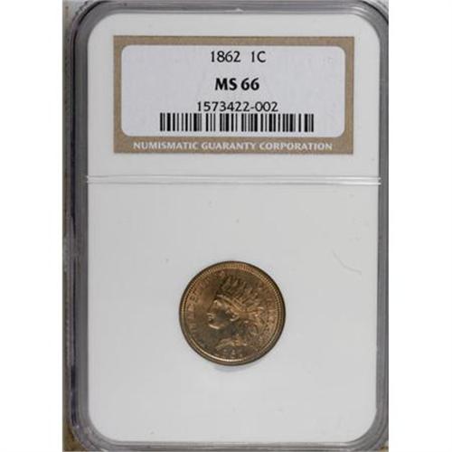 <B>1862 1C MS66 NGC.</B></I> Boldly struck, save for minor softness on the upper feather tips of the headdress, with gleaming luster and lovely golden-tan coloration that is slightly deeper-than-usual, for the type. A tiny center dot (as struck) resides between the E and N of CENT on the reverse. Minimally marked, with a few trivial nicks noted near Liberty's ear. Census: 28 in 66, 5 finer (6/07). <BR><BR><b>Shipping:</b> Coins & Currency (<a target="_blank" href="http://www.heritageauctions.com/common/shipping.php">view shipping information</a>)