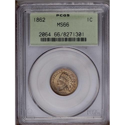 1862 1C MS66 PCGS. A lustrous olive-brown Premium Gem 1862[1C] MS66 PCGS.