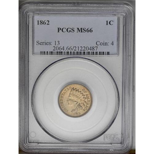 <B>1862<1C> MS66 PCGS.</B></I> This boldly impressed example is free of all but a few isolated areas of striking incompleteness. All four diamonds are clear, and the golden-tan surfaces are fully lustrous with a glistening, satiny sheen. There is no noticeable carbon on this premium quality Gem. Population: 48 in 66, 7 finer (5/06).