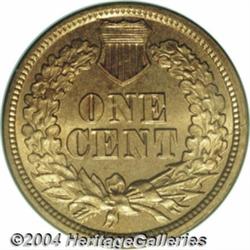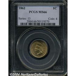 <B>1862<1C> MS66 PCGS.</B></I> A strong candidate for inclusion in a premium quality Gem type set, this lovely, honey-gold representative is sharply struck down to the tips of the feathers in Liberty's headdress. Satiny in sheen, both sides are silky-smooth from rim to rim. A die crack is noted at 3 o'clock on the reverse from the wreath to the rim. Despite its status as one of the more readily obtainable copper-nickel Indian Cents, the 1862 (28 million pieces produced) is scarce to rare in grades above the MS65 level. Population: 50 in 66, 6 finer (7/04). <BR><BR><B>Important notice:</B> Heritage usually auctions material at the rate of 200-250 lots per hour. On some occasions eBay Live bid software or the Internet may not be able to keep up with the pace of the auction. We recommend placing a realistic absentee bid now as insurance to avoid disappointment. Occasionally the auctioneer may eliminate or reject an eBay Live bid, and the auctioneer may also reopen a lot after the close of the eBay live bidding (usually because we missed an audience bid), and may reject your bid even if it shows you as the winning bidder. By bidding via eBay Live, you agree that Heritage may award the lot to another bidder at its sole discretion under the circumstances described above or any other reasonable circumstances. Since eBay bids are not shown to us until we open the lot on the floor, we treat those bids just like floor bids. In most cases the floor responds before the eBay bid is presented to us, due to Internet lag time, so for consistency we have made it a policy that floor bids are always considered first over tie eBay live bids. Also please note that all Heritage lots purchased through eBay Live carry a 20% Buyer's Premium. Please make sure you read the Terms and Conditions before you bid. </span></font></tr></table></td></tr></table>