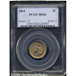 <B>1862<1C> MS66 PCGS.</B></I> This boldly impressed example is free of all but a few isolated areas of striking incompleteness. The golden-brown surfaces are fully lustrous with a glistening satin sheen. There is no noticeable carbon on the obverse of this premium quality Gem. Population: 50 in 66, 6 finer (7/04). <BR><BR><B>Important notice:</B> Heritage usually auctions material at the rate of 200-250 lots per hour. On some occasions eBay Live bid software or the Internet may not be able to keep up with the pace of the auction. We recommend placing a realistic absentee bid now as insurance to avoid disappointment. Occasionally the auctioneer may eliminate or reject an eBay Live bid, and the auctioneer may also reopen a lot after the close of the eBay live bidding (usually because we missed an audience bid), and may reject your bid even if it shows you as the winning bidder. By bidding via eBay Live, you agree that Heritage may award the lot to another bidder at its sole discretion under the circumstances described above or any other reasonable circumstances. Since eBay bids are not shown to us until we open the lot on the floor, we treat those bids just like floor bids. In most cases the floor responds before the eBay bid is presented to us, due to Internet lag time, so for consistency we have made it a policy that floor bids are always considered first over tie eBay live bids. Also please note that all Heritage lots purchased through eBay Live carry a 20% Buyer's Premium. Please make sure you read the Terms and Conditions before you bid. </span></font></tr></table></td></tr></table>