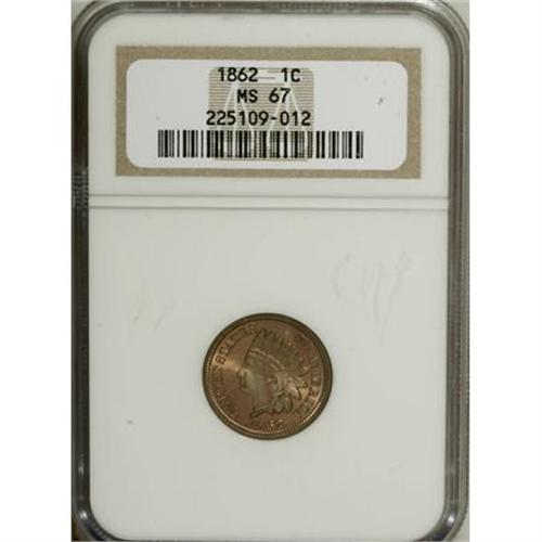 <B>1862 1C MS67 NGC.</B></I> Along with the 1863, the 1862 is one of the two copper-nickel Oak Wreath Reverse Indian cent issues chosen most often by type collectors. The variety spanned 1860 and the first four years of the Civil War, and the conflict drove almost all hard money, even copper-nickel cents, into hoards. As a consequence, Mint State examples are available today, though recall programs would later take a toll on the population.<BR> This Superb Gem representative, far from an ordinary Uncirculated example, has exquisitely preserved salmon patina with delicate sage accents at the margins. The strike is bold, with four complete diamonds on Liberty's hair ribbon. A highly appealing and extraordinary piece, with no numerically finer examples known to either NGC or PCGS (7/07).<BR><BR><B>Coin Engraver:</B> James B. Longacre<BR><BR><b>Shipping:</b> Coins & Currency (<a target="_blank" href="http://www.heritageauctions.com/common/shipping.php">view shipping information</a>\)