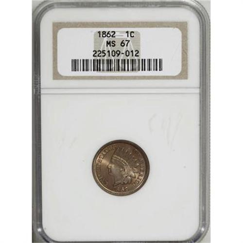 <B>1862 1C MS67 NGC.</B></I> Along with the 1863, the 1862 is one of the two copper-nickel Oak Wreath Reverse Indian cent issues chosen most often by type collectors. The variety spanned 1860 and the first four years of the Civil War, and the conflict drove almost all hard money, even copper-nickel cents, into hoards. As a consequence, Mint State examples are available today, though recall programs would later take a toll on the population.<BR> This Superb Gem representative, far from an ordinary Uncirculated example, has exquisitely preserved salmon patina with delicate sage accents at the margins. The strike is bold, with four complete diamonds on Liberty's hair ribbon. A highly appealing and extraordinary piece, with no numerically finer examples known to either NGC or PCGS (10/07).<BR><I>From The Santa Fe Collection, Part Two.</B></I><BR><BR><B>Coin Engraver:</B> James B. Longacre<BR><BR><b>Shipping:</b> Coins & Currency (<a target="_blank" href="http://www.heritageauctions.com/common/shipping.php">view shipping information</a>)
