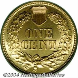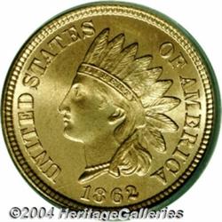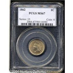 <B>1862<1C> MS67 PCGS.</B></I> Booming luster, an unimprovable strike, and magnificent preservation are the hallmarks of this honey-gold Superb Gem. Interesting die cracks (as produced) journey to the rim from the bust tip and the wreath near 9 o'clock. 1862 was the final year that Copper-Nickel Indian Cents circulated during the Civil War; they were subsequently hoarded along with gold and silver coins. Population: 5 in 67, none finer (3/04). <BR><BR><B>Important notice:</B> Heritage usually auctions material at the rate of 200-250 lots per hour. On some occasions eBay Live bid software or the Internet may not be able to keep up with the pace of the auction. We recommend placing a realistic absentee bid now as insurance to avoid disappointment. Occasionally the auctioneer may eliminate or reject an eBay Live bid, and the auctioneer may also reopen a lot after the close of the eBay live bidding (usually because we missed an audience bid), and may reject your bid even if it shows you as the winning bidder. By bidding via eBay Live, you agree that Heritage may award the lot to another bidder at its sole discretion under the circumstances described above or any other reasonable circumstances. Since eBay bids are not shown to us until we open the lot on the floor, we treat those bids just like floor bids. In most cases the floor responds before the eBay bid is presented to us, due to Internet lag time, so for consistency we have made it a policy that floor bids are always considered first over tie eBay live bids. Also please note that all Heritage lots purchased through eBay Live carry a 20% Buyer's Premium. Please make sure you read the Terms and Conditions before you bid. </span></font></tr></table></td></tr></table>