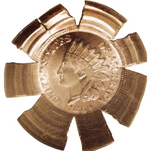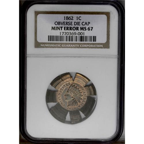 <B>1862<1C> Indian Cent--Obverse Die Cap--MS67 NGC.</B></I> This is one of the most stunning and spectacular errors that we have seen or handled. Three years ago, while working for another numismatic firm, this cataloger had the privilege of handling this same piece. Now as then, it remains a remarkable illustration of what can go wrong during coining operations. Although coinage presses in 1862 did not operate with nearly the same speed as modern day presses, they could still strike quite a large number of coins every minute.<BR> A die cap is created when a blank planchet literally sticks to the die through multiple press cycles. The successive cycle of the press, over a short period, probably seconds rather than minutes, caused the planchet to expand slightly, and the obverse detail to become just a little sharper in definition. As the metal expanded, it also became more brittle and eventually split into a fan shape with eight individual tabs. Clearly, the copper-nickel (in this case 12% nickel and 88% copper) was quite hard and certainly contributed to the appearance that is now so coveted.<BR> The obverse is exceptionally sharp, especially at the center, with every feather tip and every diamond fully and completely defined. The legend and date are drawn to the border, with the border design extensively drawn out onto the individual tabs. This Superb Gem is highly lustrous with wonderful tan color accented by light blue color in the fields. This is a uniface example with no design visible on the reverse, possibly the result of two planchets fed into the press at the same time, but more likely the repeated blows of the die cap that caused the reverse design to expand and eventually disappear entirely. For the connoisseur who appreciates the combination of impressive quality and outrageous character.