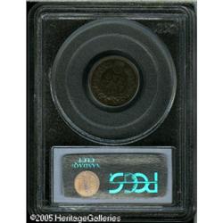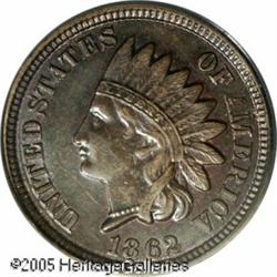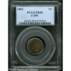 <B>1862 1C One Cent, Judd-290, Pollock-348, Low R.7, PR58 PCGS.</B></I> An off-metal strike from the regular Indian Cent dies, produced in copper with deep brown and lighter olive color. Faint traces of original red mint color appear in the protected areas of the design. Currently listed in the new "Judd" book as Low Rarity-7; however, Andrew Pollock rated this R.8. Lot:9830