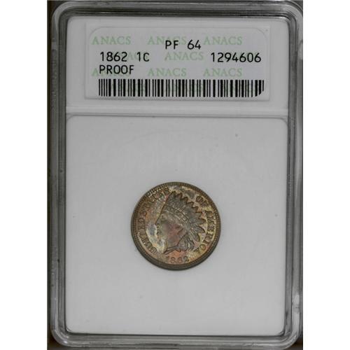 <B>1862<1C> PR64 ANACS.</B></I> The toning on this piece is an interesting mix of orange, lavender, and blue. Moderately mirrored with faint hairlines in the fields that restrict the grade.
