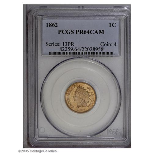<B>1862<1C> PR64 Cameo PCGS.</B></I> This Civil War era copper-nickel cent displays light golden-tan patina on nicely cameoed surfaces. Boldly impressed, with all 4 diamonds revealing sharp definition. A few tiny light flecks are noted over each side, and a dark toning spot is buried in the lower part of the shield. Population: 12 in 64, 31 finer (9/05).