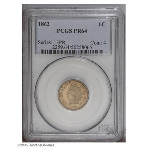 1862 1C PR64 PCGS. Sharply struck with smooth, seeming 1862[1C] PR64 PCGS.