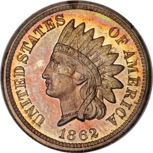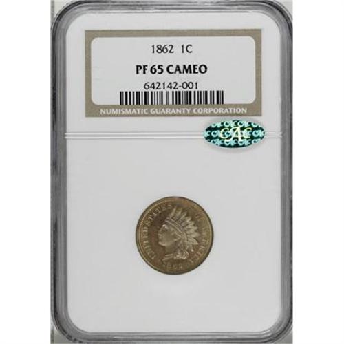 <B>1862 1C PR65 Cameo NGC. CAC.</B></I> While business strikes of this issue were produced in considerable numbers, the proof emission was limited to 550 pieces. The present Gem has reflective fields and intricately struck devices. Attractively toned in lemon-gold, fire-red, lime, and lilac-rose. Census: 16 in 65 Cameo, 21 finer (3/08).<BR><BR><b>Shipping:</b> Coins & Currency (<a target="_blank" href="http://www.heritageauctions.com/common/shipping.php">view shipping information</a>)