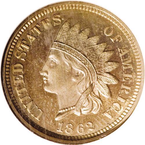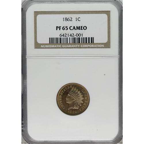 <B>1862 1C PR65 Cameo NGC.</B></I> While business strikes of this issue were produced in considerable numbers, the proof emission is estimated to be on the smaller side for the era, at 550 pieces. The present example offers lustrous olive-gold surfaces that are sharply struck and offer much pleasing field-device contrast. Census: 14 in 65 Cameo, 20 finer (4/07).<BR><BR><b>Shipping:</b> Coins & Currency (<a target="_blank" href="http://www.heritageauctions.com/common/shipping.php">view shipping information</a>)