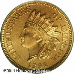 1862 1C PR65 Cameo PCGS. The 1862 is generally con <B>1862 1C PR65 Cameo PCGS.</B></I> The 1862 is generally considered the type coin of the copper-nickel series, but very few actual Gems are available to collectors, especially with cameo contrast. This is a well-produced coin that has deeply mirrored, flashy fields and even reddish-golden color--actually more suggestive of a bronze coin than one with a copper-nickel composition. Unlike the previous year's proofs, this piece is typical of most 1862s with razor sharp definition on all the design elements. The only flaw we see is an irregular planchet flake out of the lower left obverse field in front of the point of the truncation of the Indian's neck. Population: 14 in 65 Cameo, 18 finer (11/04). <BR><BR><B>Important notice:</B> Heritage usually auctions material at the rate of 200-250 lots per hour. On some occasions eBay Live bid software or the Internet may not be able to keep up with the pace of the auction. We recommend placing a realistic absentee bid now as insurance to avoid disappointment. Occasionally the auctioneer may eliminate or reject an eBay Live bid, and the auctioneer may also reopen a lot after the close of the eBay live bidding (usually because we missed an audience bid), and may reject your bid even if it shows you as the winning bidder. By bidding via eBay Live, you agree that Heritage may award the lot to another bidder at its sole discretion under the circumstances described above or any other reasonable circumstances. Since eBay bids are not shown to us until we open the lot on the floor, we treat those bids just like floor bids. In most cases the floor responds before the eBay bid is presented to us, due to Internet lag time, so for consistency we have made it a policy that floor bids are always considered first over tie eBay live bids. Also please note that all Heritage lots purchased through eBay Live carry a 20% Buyer's Premium. Please make sure you read the Terms and Conditions before you bid. This lot is being auctioned in conjunction with a live floor auction by Heritage Galleries & Auctioneers. All final auction and invoice information will be supplied by Heritage Galleries & Auctioneers, and all other information should be considered preliminary. Lot:5114