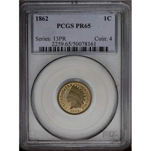 <B>1862<1C> PR65 PCGS.</B></I> Subtly mirrored beneath layers of milky olive-gray patina. A few minor carbon flecks are noticed on the obverse, the most noticeable of which is attached to the fourth feather of the headdress. Population: 76 in 65, 31 finer (3/06). <BR><BR><B>Important notice:</B> Heritage usually auctions material at the rate of 200-250 lots per hour. On some occasions eBay Live bid software or the Internet may not be able to keep up with the pace of the auction. We recommend placing a realistic absentee bid now as insurance to avoid disappointment. Occasionally the auctioneer may eliminate or reject an eBay Live bid, and the auctioneer may also reopen a lot after the close of the eBay live bidding (usually because we missed an audience bid), and may reject your bid even if it shows you as the winning bidder. By bidding via eBay Live, you agree that Heritage may award the lot to another bidder at its sole discretion under the circumstances described above or any other reasonable circumstances. Since eBay bids are not shown to us until we open the lot on the floor, we treat those bids just like floor bids. In most cases the floor responds before the eBay bid is presented to us, due to Internet lag time, so for consistency we have made it a policy that floor bids are always considered first over tie eBay live bids. Also please note that all Heritage lots purchased through eBay Live carry a 20% Buyer's Premium. Please make sure you read the Terms and Conditions before you bid. This lot is being auctioned in conjunction with a live floor auction by Heritage Galleries & Auctioneers. All final auction and invoice information will be supplied by Heritage Galleries & Auctioneers, and all other information should be considered preliminary. Lot:433 <BR><BR><B>Winning Notification and Billing:</B> After the FINAL session in this auction is complete, Heritage will send e-mail and snail mail invoices. This process normally takes several days. All final auction and invoice information will be supplied by Heritage Galleries & Auctioneers, and all other information should be considered preliminary. <BR><BR>This auction will be conducted on a live auction floor and over the Internet through eBay Live. If you choose to place an absentee bid, please take a moment to <font color='#0000ff'><u><a href='http://pages.ebay.com/liveauctions/help/before/laabsentee.html'>learn how eBay Live absentee bidding works</a></u></font><font color='#000000'>