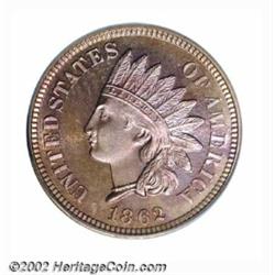 1862 1C PR65 PCGS. This is a simply gorgeous Gem with variegated salmon-pink, lilac, and honey-tan colors. Both sides are fully impressed, and modest, yet appreciable brightness is seen in the fields. With no singularly mentionable blemishes, this coin is worthy of a premium quality bid. Important notice: We expect to be auctioning lots at the rate of 200-250 per hour. Sometimes eBay Premier live bid software cannot keep up with that pace, so we strongly recommend that you place a realistic proxy bid now as insurance to avoid disappointment. Also please note that all Heritage/CAA lots purchased through eBay Premier carry a 20% Buyer's Premium. Please make sure you read the Terms and Conditions.