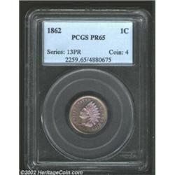 1862 1C PR65 PCGS. This is a simply gorgeous Gem with variegated salmon-pink, lilac, and honey-tan c