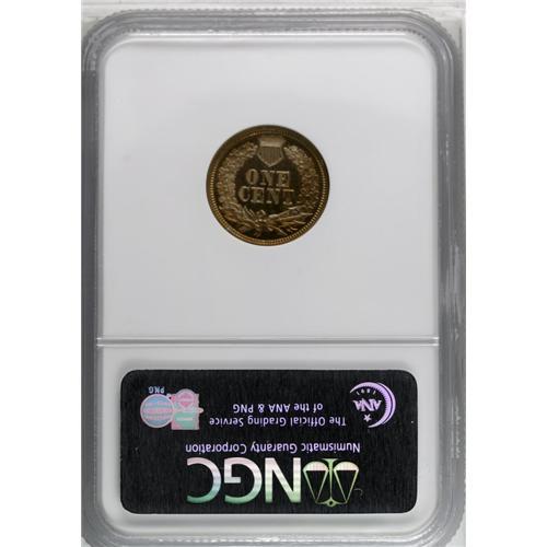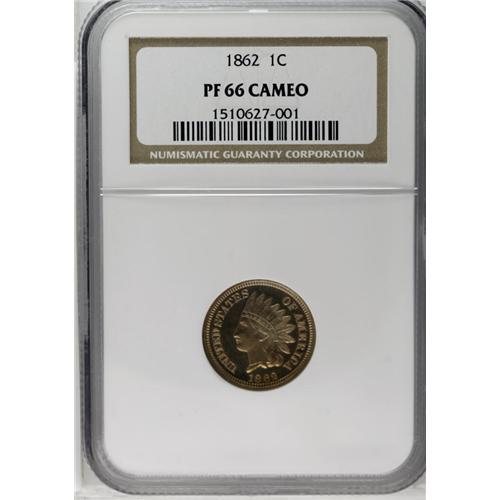 <B>1862<1C> PR66 Cameo NGC.</B></I> Probably fewer than half of the 550 proof cents struck in 1862 are extant today, especially with an outstanding cameo such as seen on the present Premium Gem. Warm orange-gold surfaces display blushes of tan-gray, and powerfully impressed design elements appear to be suspended over the mirrored fields when the coin is tilted beneath a light source. A few tiny inoffensive flecks are all that stands in the way of an even higher grade for this magnificent piece. Census: 15 in 66, 4 finer (6/06).