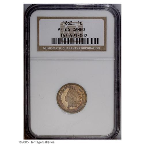 <B>1862<1C> PR66 Cameo NGC.</B></I> The Philadelphia Mint produced at least 550 proof Indian Cents in 1862. With at least half of the original mintage believed extant, this issue is the only readily obtainable Copper-Nickel Indian in proof. The present Gem, however, is one of only fifteen examples designated as PR66 Cameo by NGC, with only three proof Cameos graded finer (10/05). A simply gorgeous specimen, the surfaces shimmer with well mirrored fields. The otherwise tan colored features reveal rich pinkish-lilac highlights over certain peripheral areas. Powerfully struck, and even more carefully preserved.