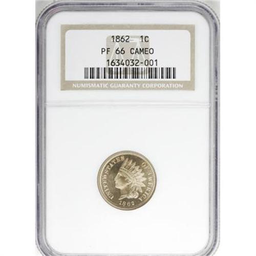 <B>1862 1C PR66 Cameo NGC.</B></I> The deeply mirrored, lustrous tan-gold surfaces provide marvelous contrast with the pleasingly frosted devices on each side. An intricate strike imparts razor-sharp definition to the headdress and the four diamonds, as well as throughout the devices. Census: 17 in 66 Cameo, 4 finer (1/08).<BR><BR><b>Shipping:</b> Coins & Currency (<a target="_blank" href="http://www.heritageauctions.com/common/shipping.php">view shipping information</a>)