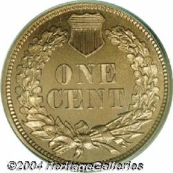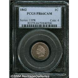 <B>1862<1C> PR66 Cameo PCGS.</B></I> The 1862 is the most available Copper-Nickel Cent in proof format. Some 550 pieces were originally struck and probably half that number are extant today. However, only a tiny percentage of those surviving pieces show the cameo contrast that collectors find so appealing. The fields on this piece are very deeply mirrored and glassy with noticeable mint frost over the devices. An immaculately preserved coin, there is an abundant amount of lilac-silver patina on each side. Population: 15 in 66, 3 finer (9/04). <BR><BR><B>Important notice:</B> Heritage usually auctions material at the rate of 200-250 lots per hour. On some occasions eBay Live bid software or the Internet may not be able to keep up with the pace of the auction. We recommend placing a realistic absentee bid now as insurance to avoid disappointment. Occasionally the auctioneer may eliminate or reject an eBay Live bid, and the auctioneer may also reopen a lot after the close of the eBay live bidding (usually because we missed an audience bid), and may reject your bid even if it shows you as the winning bidder. By bidding via eBay Live, you agree that Heritage may award the lot to another bidder at its sole discretion under the circumstances described above or any other reasonable circumstances. Since eBay bids are not shown to us until we open the lot on the floor, we treat those bids just like floor bids. In most cases the floor responds before the eBay bid is presented to us, due to Internet lag time, so for consistency we have made it a policy that floor bids are always considered first over tie eBay live bids. Also please note that all Heritage lots purchased through eBay Live carry a 20% Buyer's Premium. Please make sure you read the Terms and Conditions before you bid.
